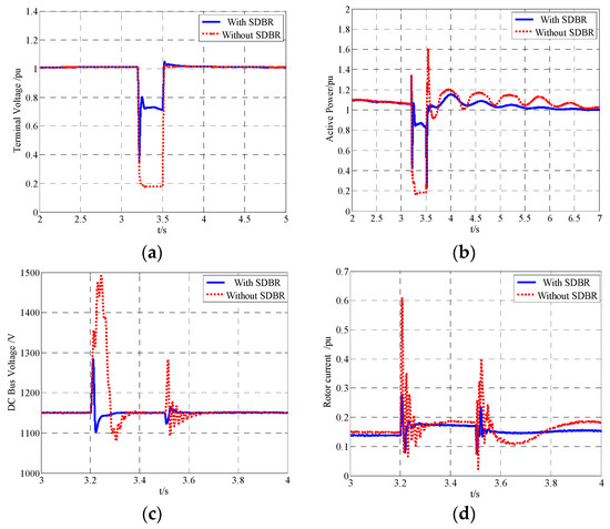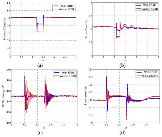 As seen in Figure 8a and b, during a severe grid voltage drop, the input of the SDBR increased the terminal voltage so it could satisfy the requirement of terminal voltage in the LVRT process. After the fault was removed, the recovery procedure of the active power was more rapid and stable, which helped to restrain the acceleration of the DFIG rotor. From Figure 8c and d, it can be seen that when the fault occurred and was removed, the SDBR under fuzzy control effectively limited the DC bus voltage and the rotor current amplitude.
