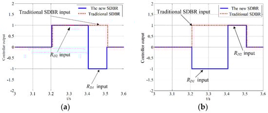 The traditional action voltage of an SDBR is 0.5, the resistance value is RD1, the controller output is 1 on behalf of the resistance input, and the 0 is not invested. In scene 1 and scene 2, comparing the traditional SDBR and the SDBR in this paper, the output signals of the controller are as shown in Figure 10.