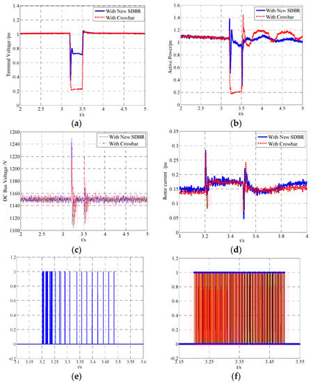 Simulation results of the SDBR and crowbar circuits. (a) Stator voltage; (b) Active power; (c) DC bus voltage; (d) Rotor current; (e) DC chopper circuit action signal; (f) Inverter control signal of the crowbar circuit.