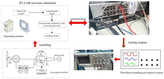 The real-time simulation platform in the laboratory was built as shown in Figure 14. The major parts of the platform include a host computer, an RT-LAB real-time simulation device (Opal-RT, Montreal, QC, Canada), and a digital storage oscilloscope. RT-LAB is fully integrated with MATLAB/Simulink and supports a large number of input/output (I/O) cards. Firstly, compiling the model established in MATLAB, the corresponding C code can be formed. The second step is to allocate SM_ and SS_ subsystems to the corresponding target cores. The third step is to download the compiled C code to the allocated cores. Finally, the real-time simulation is performed.