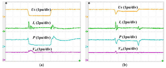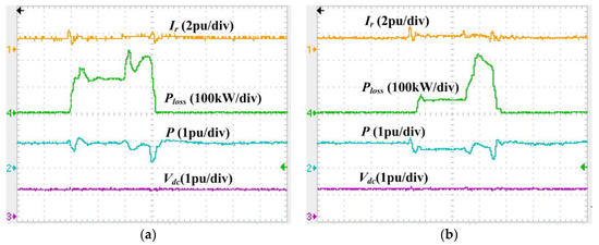 The first experimental situation was selected as the serious voltage sag in Section 5.2. The voltage dropped to 15% of its nominal value and the voltage dip lasted for 300 ms. Figure 15a and b shows the experimental results without and with the SDBR.