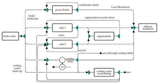 Schematic of water pathways in industrial plants (dash lines can be subjected to heating or cooling duties).