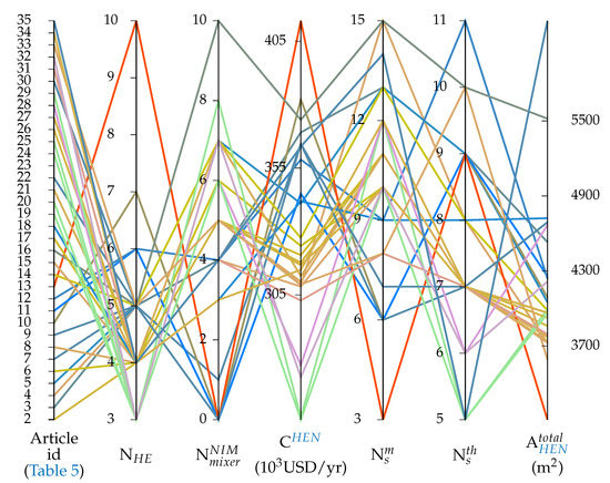This case study further illustrates the necessity of considering more indicators while optimizing heat-integrated water allocation networks. Among the 33 visualized results in Figure 2, 29 results possess 3–5 heat exchangers (the maximum is 10). This may indicate good compromise in HEN investment costs; however, for the same solutions, the number of mixers, non-isothermal mixers and total heat exchange area vary 3–13, 0–10, and 3500–6300 m, respectively. These “neglected” indicators should be somehow addressed in HIMAN synthesis problems which necessitate the application of multi-criteria decision making approaches. In addition, no single solution can possess the optimal value for all indicators, which correspondingly requires the generation of a set of potential solutions that can be analyzed, instead of a single “optimal” solution.