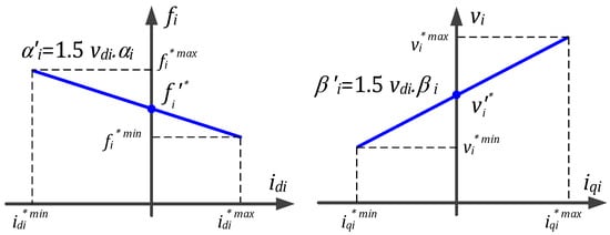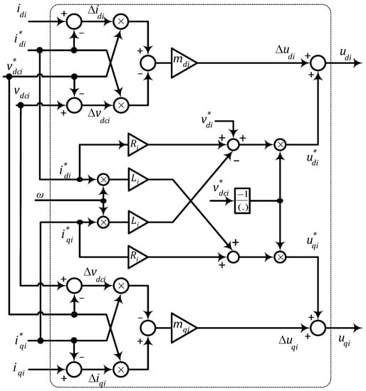 where . The AC-side voltage of the inverter () can be modeled as the product of the switching state function ( & ) with the DC-side voltage (vdci) []. On the other hand, by considering d-axis vector in the direction of dq voltage, the q-component of the voltage is zero []. Therefore, considering and , Equation (36) can be simplified as follows: