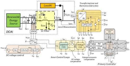 The proposed control approach is based on Direct Lyapunov Stability Theory (DLST) [,] in a hierarchical structure. The Lyapunov function () for each DG unit is the energy of the system during a dynamic change which can be written as follows: