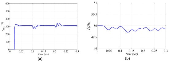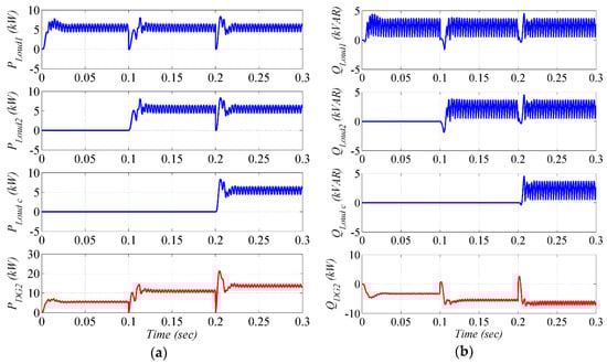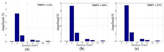 In Figure 10, the voltage harmonic compensation of the proposed controller can be seen, clearly. The amounts of voltage harmonics are maintained in the desired range based on IEC 61000-2-2 [] after a major harmonically-distorted load change. The amounts of loads are almost doubled in each change, but the amount of voltage total harmonic distortion is regulated under 5%. In other words, the total harmonic distortion (THD) of voltages is regulated properly by the controller. The harmonic contents of PCC voltages are also illustrated in Figure 10, in which their variations are within the standard range.