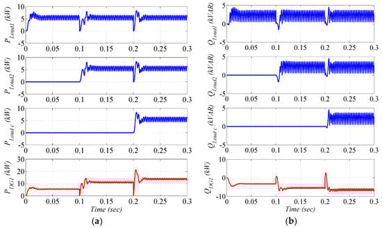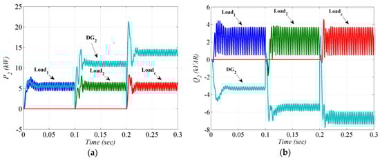 The main goal of the study is the regulation of PCC voltages, which can be seen in Figure 8 and Figure 9. The magnitude and frequency of PCC voltages are maintained in the desired range during sudden changes of loads with small appropriate transients. In this situation, the proposed local control system works properly to adjust the voltage of DG units for different loading conditions. The consideration of the effect of voltage harmonics is an important part to reach these results.