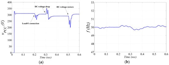 (a) Magnitude and (b) frequency variations of phase voltages at PCC.