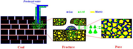 Cleats in coal reservoirs are the place and channels where materials exchange with the outside, which significantly impact coal permeability. However, cleats in coal reservoirs are full of carbonate minerals and silicate minerals, like calcite, dolomite, hematite, pyrite, quartz, and kaolinite. Acidizing means that one or several acids are injected into coal reservoirs to dissolve corrosion cement in coal reservoirs or blockages in cleats (Figure 1).