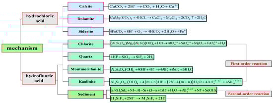 - The chemical reactions of the acid and the minerals in the coal are summarized. The reaction kinetics of the acid and the minerals in the coal and the influencing factors of the acid-coal reactions are analyzed. On account of the dynamic equation, the composition of coal, the surface area of the acid-coal reaction, the mass fraction of HF, and the environmental conditions of the reaction system will all impact the process of reaction.