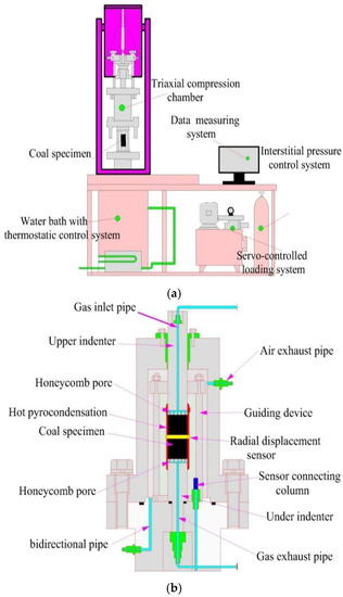 The triaxial servo-controlled seepage equipment for thermo-fluid-solid coupling of gas-bearing coal. (a) Schematic diagram; (b) Schematic diagram of the triaxial cell.