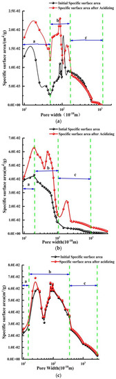 Figure 9 and Figure 10 display that SSA and pore volume are closely related to pore width. SSA and the pore volume of the coal experience an increase at first and then decrease with changing pore diameter. There are three main ranges—elevating area a, where SSA increases promptly, peak area b, where SSA peaks, and reducing area c, where SSA reduces slowly—in the relationship curve between SSA and pore width. The pore size of coal is concentrated at about 10 nm, which has important influence on SSA and pore volume. With coal rank, SSA and pore volume increase correspondingly. Moreover, the SSA and pore volume of coal effected by acidizing is obvious when the diameter of coal is less than 10 nm. Finally, the SSA and pore volume of low medium metamorphic coal is easily affected by acidizing, especially when it contains carbonate, which is the most suitable to carry out the acidizing. Therefore, it is possible to increase the permeability of coal by injecting acids in to cleats.