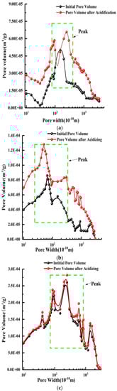 Relationship between pore volume and pore width. (a) Qian Jiaying specimens; (b) Xiaonan specimens; (c) Liujia specimens.