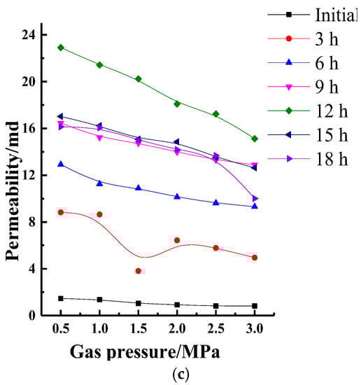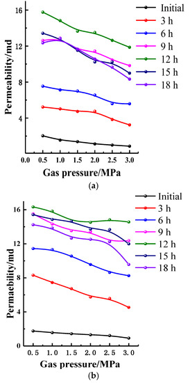 Figure 11 presents the permeability change laws with the gas pressure. The permeability of the coal specimens increased significantly under 3 h, 6 h, 9 h, 12 h, 15 h, and 18 h of acidizing. Using the acid mass fraction of 12% as an example: first, when the gas pressure is 0.5 MPa, the permeability rises from 1.762 × 10−15 m2 to 15.521 × 10−15 m2 after 9 h, and the multiple is 8.81 times. The permeability increases from 1.762 × 10−15 m2 to 14.234 × 10−15 m2 after 18 h, and the multiple is 8.08 times. Second, when the gas pressure is 1.5 MPa, the permeability rises from 1.439 × 10−15 m2 to 14.656 × 10−15 m2 after 9 h, and the multiple is 10.18 times. The permeability increases from 1.439 × 10−15 m2 to 12.656 × 10−15 m2 after 18 h, and the multiple is 8.79 times. Third, when the gas pressure is 3 MPa, the permeability rises from 0.923 × 10−15 m2 to 14.561 × 10−15 m2 after 9 h, and the multiple is 15.77 times. The permeability increases from 0.923 × 10−15 m2 to 9.568 × 10−15 m2 after 18 h, and the multiple is 10.37 times. Acidizing has boosted permeability and the optimum time is 12 h. In the later period of acidizing, permeability slightly decreases, because some mineral absorbing water results in expansion, which has a negative effect on pore development. Therefore, the acidizing time should be about 12 h.