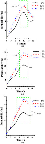 Permeability change trend when acid mass fraction is (a) 9%, (b) 12%, (c) 15%.