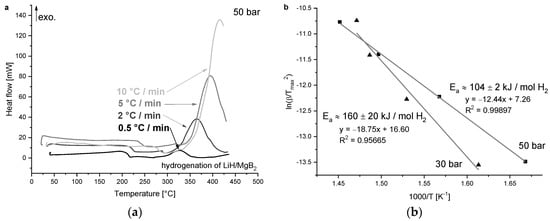 where β represents the heating rate for the curve and Tmax is the temperature at which the calorimetric peak is centred. The activation energy value can be calculated as the slope of the linear fit for the data acquired, plotting ln(β/T2max) against 1000/T, as suggested by Equation (2). In Figure 1a, the heat flow signal for the measurement under 50 bar of H2 is plotted against temperature. In Figure 1b, the corresponding Kissinger plot is shown. The equivalent Kissinger plot for the measurement under 30 bar of hydrogen is also illustrated in Figure 1b. Taking into account the slopes displayed in Figure 1b, the activation energy values are calculated as 104 ± 2 kJ mol−1 H2 at 50 bar and 160 ± 20 kJ mol−1 H2 at 30 bar of applied H2 pressure.