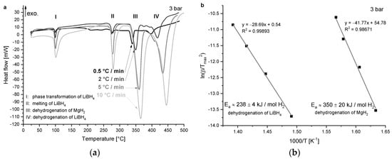 The measurements performed under desorption conditions, at 3 bar of H2, are shown in Figure 2. As it was already observed and discussed for the desorption Pressure Concentration Isotherms (PCI) curves in the previous study of this two-part investigation [16], in dynamic conditions, it is possible to observe two decomposition steps, in agreement with previously reported works [28,29]. Starting from these two distinct dehydrogenation processes, represented in Figure 2a by peak III and peak IV for MgH2 and LiBH4, respectively, the activation energy values can be calculated, as shown in Figure 2b.