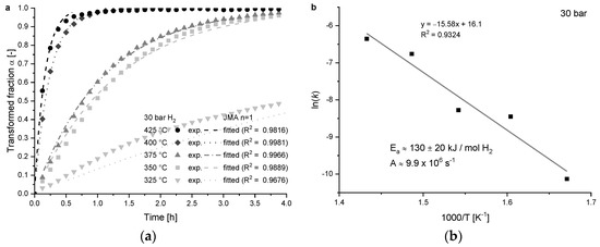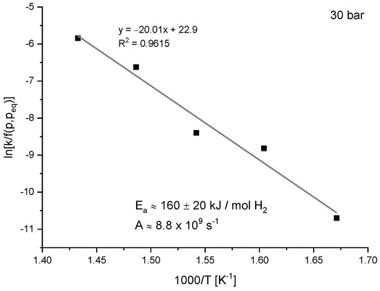 In agreement with Equation (4), the slope of the segment fitting the data linearly corresponds to the activation energy value divided by the ideal gas constant R. Thus, following this method for the case of 30 bar of H2 pressure, the value of the activation energy is 130 ± 20 kJ mol−1 H2. This value and the one obtained applying the Kissinger method present a difference, which is discussed in further detail in Section 4.1.