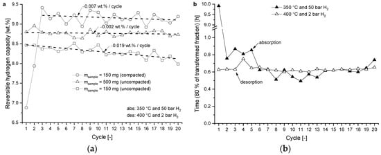 The reversible hydrogen capacity and its corresponding kinetic behaviour, both for the hydrogenation and dehydrogenation processes, are analysed in this section. In Figure 4a, the reversible hydrogen capacity (obtained from desorption data) is displayed as a function of 20 cycles for 150 mg of compacted and uncompacted material. Additionally, the hydrogen capacity for a 500 mg sample is shown and compared. In Figure 4b, its kinetic behaviour is described by plotting the time required to complete 80% of the reaction upon cycling; in these experiments, the absorption has been performed under 50 bar H2 at 350 °C, and the desorption under 2 bar H2 at 400 °C.