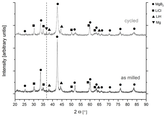 In the following lines, the discussion is focused on the reversible hydrogen capacity. The maximum theoretical gravimetric density of the material of 11.54 wt % has not been reached in this study after several cycles (see Section 3.1.2.). In fact, this capacity is already slightly reduced by the addition of the 0.05 mol of TiCl3. Figure 6 shows the XRD analyses of the material after milling and cycling. After milling, the XRD pattern exhibits reflections mainly coming from MgB2, LiH, and LiCl. There is just one reflection at around 2θ = 36° that might belong to free Mg, though it is not clear. In the case of the material after cycling and in dehydrogenated state, the presence of MgB2, LiH, LiCl, and free Mg is noticed. It is important to point out that TiCl3 is not detected after milling and cycling. The presence of LiCl suggests that TiCl3 interacts with the major phases, i.e., 2LiH+MgB2.