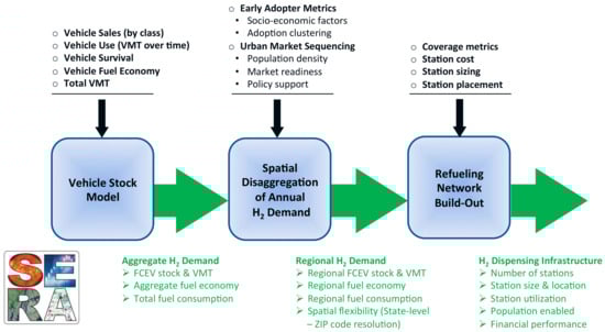 The demand-side and refueling infrastructure buildout modules of SERA projects geospatially and temporally resolved scenarios of hydrogen refueling infrastructure deployment based on projected demand for hydrogen in the LDV sector, following three steps (Figure 1) []: