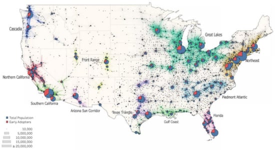 Population and total early adopters metric (EAM) (defined as the fraction of the total EAM for the urban area, normalized to 100 million) per U.S. urban area. Population data taken from U.S. Census Bureau. The mega-regions color-coded in the figure indicate frequency and geographic extent of household vehicle commuting patterns between cities, and are derived from a recent study on travel data [].