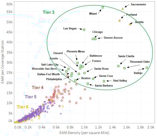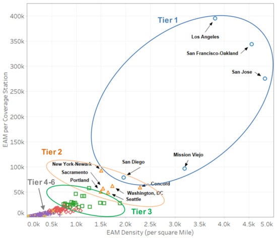 Prioritization of urban markets by EAM density and EAM per coverage station.
