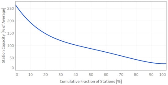 This algorithm results in a situation where the average station capacity is small in early years, but approaches the maximum size as time progresses. For each year , stations are built with capacity and location chosen according to the following two algorithms.