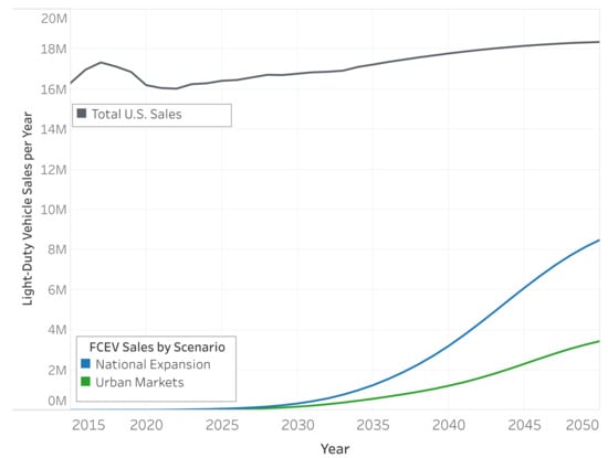 Figure 5 reports FCEV sales over time for the two scenarios considered in this paper, together with total LDV sales in the United States, as projected in the 2017 Annual Energy Outlook (AEO) []. Note that near-term (2016–2020) FCEV sales match forecasts reported by the California Energy Commission [,], since California is the only U.S. state in which FCEVs are currently commercially available.