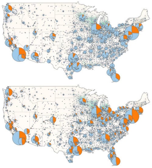 In particular, FCEV adoption over time in different U.S. urban areas [] relies on computing an “early adopters” metric (EAM) that is intended to capture the positive impact of several socioeconomic factors, such as population density and vehicle preference (based on adoption of alternative fuel and luxury vehicles []), on FCEV adoption. EAM is the proxy metric used in the SERA analysis to predict the differential adoption of FCEVs over time. These EAM are computed from demographic and vehicle registration data, including estimated affinity of different neighborhoods for fuel cell vehicles (derived from historical sales of alternative fuel vehicles, such as hybrid electric vehicles (HEVs) and plug-in electric vehicles (PEVs). See [] for more details). Total population and number of early adopters are shown in Figure 2 for the 621 largest urban areas in the United States considered in this study (including a total of 225 million people and a total of 63 million for the EAM). Results show how the EAM is not necessarily geographically correlated with population: Los Angeles, for example, has the highest total EAM in the country, but not the highest total EAM relative to population (San Francisco shows a higher EAM share), and cities in different areas of the country show very different EAM shares.