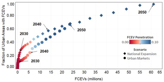 Figure 7 shows the share of urban areas in which FCEVs are adopted (and refueling stations built) as the overall national FCEV market evolves (both in terms of total FCEVs and over time). In the National Expansion scenario (diamonds), the network of stations expands more quickly, and the share of FCEV penetration increases more rapidly over time. However, the more concentrated expansion in the Urban Markets scenario (dots) allows for reaching a higher FCEV penetration share for a given number of total FCEVs. The more rapid network expansion in the National Expansion scenario leads to a dilution of FCEVs across multiple cities. This effect is mitigated over time by the more aggressive vehicle deployment trends. These scenarios illustrate alternative FCEV and hydrogen refueling station deployment scenarios, and can be used as bracketing cases for studying broader impacts of FCEV adoption.
