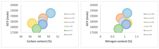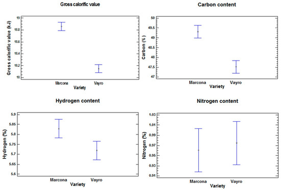 Plants show a huge amount of similarities in properties between species, yet with significant specific variations such as the ones related to combustion properties. In this research, we focused on contrasting whether the differences were also notable between varieties within the same species. Marcona and Vayro varieties were statistically compared by means of variance analysis. The results obtained are shown on Figure 1. As we can see, the gross calorific value of Marcona (18858.70 J·g−1) was statistically higher than the one obtained by Vayro (18148.20 J·g−1). The same results were reached in the evaluation of the carbon and the hydrogen contents, while no differences were found for the nitrogen content. Marcona has been described in previous research as a variety with very high residue productivity (13.91 kg dry matter/tree) [20], this variety could be of interest in order to obtain not only a higher level of biomass in weight per tree but also a higher energetic potential because of its superior gross calorific value.