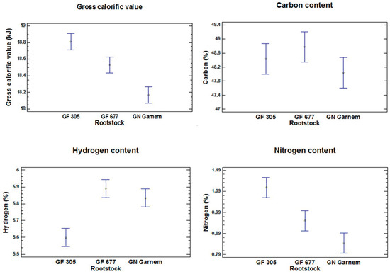 It has been widely studied that the selection of an appropriate rootstock is a key factor in fruit trees, as rootstocks can confer better adaptability to climatic and edaphic conditions and have influence on the plant mineral uptakes, the yield properties and efficiency, and the vigor of the grafted variety [54]. Figure 2 presents the statistical comparison of rootstocks by means of variance analysis. The rootstock with the highest gross calorific value was GF 305 (18850.70 J·g−1) and the lowest gross calorific value was presented by rootstock GN Garnem (18148.20 J·g−1). These differences between rootstocks cannot be attributed in our study to differences in carbon content, as we can see in Figure 2. This result would not correspond to those published by Demirbaş [55], in which the heating power was linked to the oxidation phase of the fuels, and in which carbon commonly dominated and overshadowed small changes of the hydrogen content. Although the contents of nitrogen in almond trees are low compared to other species [50], we can see that the rootstock factor affects nitrogen levels. In this study, the rootstock with the lowest nitrogen content is GN Garnem (0.84%) followed by GF 677 (0.95%). Nox and N2O gases are generated when obtaining energy through biomass and are highly polluting [56]. These emissions directly depend on the nitrogen content of the biomass and must be as limited as possible.
