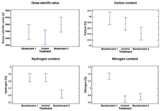 The direct uptake of organic compounds from the soil solution by the root system constitutes an important base of nutrients for the plant [57]. The purpose of this essay is to obtain greater knowledge on how the composition of fertilizers can modify the characteristics of residual biomass obtained in almond trees. No significative differences were found in terms of carbon content between the tested biostimulants and the control test; however, biostimulant 1 showed a higher carbon content than biostimulant 2. (Figure 4). The gross calorific value of the samples was not affected by fertilization, either. These results are in agreement with those obtained by Ercoli [58], in which the supply of N fertilizers in Miscanthus translated into a higher biomass yield, but did not affect the calorific value of the crop. Results obtained for biostimulant 1 regarding hydrogen and nitrogen contents are higher than those of biostimulant 2. These outcomes could be partially explained by the composition of the products, since biostimulant 1 mainly provides saccharides and amino acids (tryptophan, glutamic and GABA), which are very fast absorbing molecules [57]. Similar conclusions were reached by Mantineo [59], where extra doses of nitrogen fertilization led to a higher nitrogen concentration in the studied biomass. As high N produces a negative impact on the environment, due to nitrogen dioxide emissions [19], fertilizers that promote an increase of the percentage of N may be considered to be environmentally disadvantageous for biomasic uses.