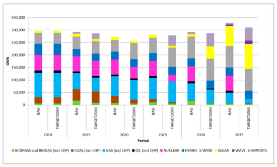 Regarding nuclear power plants, the BAU scenario assumes a constant nuclear power capacity installed until 2035 considering that the current power plants will be allowed to extend their lifetimes beyond the 40 or even 50-years-period.