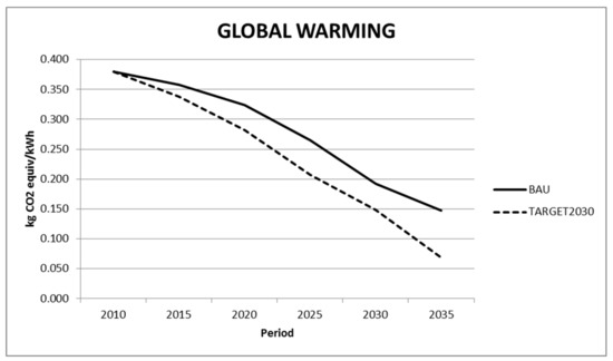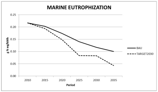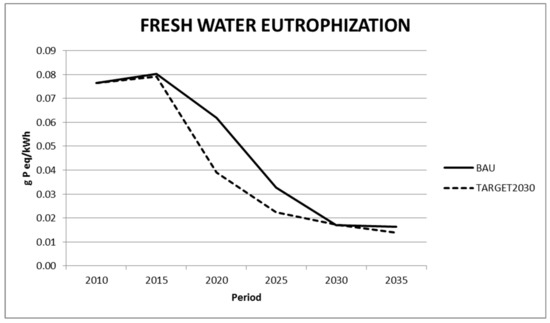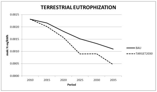 Results from this work show that soil acidification and eutrophication impacts—either terrestrial, fresh water or marine—follow a decreasing trend in the two analyzed scenarios, mainly due to phase out of coal electricity technologies, which are compensated by the penetration of renewables. In most impact categories analyzed in this work, the most decarbonized scenario (TARGET2030) shows the lowest values.