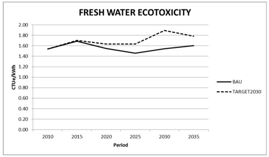 In the above mentioned impacts, a clear synergy between the climate mitigation polices and the conservation of water, land and ecosystems can be observed. However, aquatic ecotoxicity impacts tend to rise in both scenarios being this trend higher in the most decarbonized scenario with 4% increase in the BAU scenario and 16% increase in the TARGET2030. The increase in wind and solar PV drives the observed increase in ecotoxicity impacts. These impacts are linked to the waste management processes of these technologies. Although solar PV and wind are already mature technologies, there is a lack of awareness concerning the best available technologies to handle the end of life stage. Few studies have been able to collect enough real information to study this phase and further research is needed to better describe and take into consideration the real performance of the whole life cycle [64].