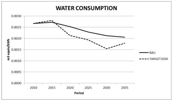 The results displayed in Figure 10 are especially relevant for a semiarid country like Spain, where increasing concerns about possible future scarcity of water in a context of uncertain climate change consequences exist. Valin and his colleagues argued that, in future scenarios, the lack of consideration of water scarcity, induced by climate change in energy planning could lead to high costs and probably the curtailment of some water intensive technologies [11]. Our results show that, thanks to the adoption of technological improvements, especially in CSP, these problems are not expected to take place since, even in a context of very high penetration of renewables technologies, water use by electricity generation is significantly reduced. To shed more light to this very important result, this impact will be further investigated in future studies by using the new impact method proposed by the Life Cycle Initiative WULCA on the Available Water Remaining (http://www.wulca-waterlca.org/project.html).