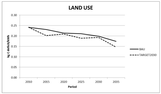 The impacts on land use, measured in terms of loss of C due to land use change, follow a downwards pattern in both scenarios. Despite the increased penetration of renewable energies, this downward trend is slightly more remarkable in the TARGET2030 scenario. According to this result, the capacity of the territory to support food production will not be hindered in any of the scenarios.