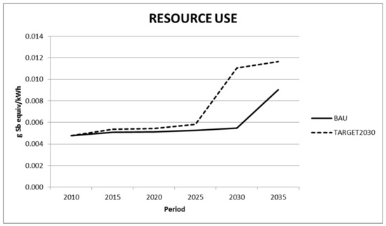 As shown in Figure 12, the impact on resource use increases in both scenarios, although the growth is higher in the TARGET2030 scenario (140%). The main technologies contributing to this impact are solar photovoltaic and wind energy. The importance of these technologies in the TARGET2030 scenario is the highest compared to other technologies and also their contribution to the electricity mix is much higher than in BAU.