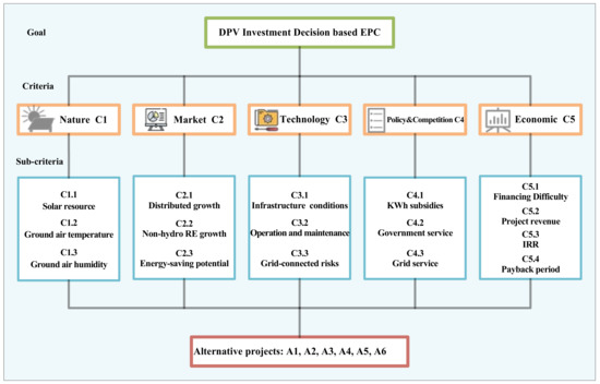 In recent years, researches on PV investment have mainly focused on the following aspects: (1) Risk analysis of PV power generation projects: analysis of risk factors and establishment of risk assessment models, application of risk models to provide decision-making information for investment decision-makers (DMs) [4,5,6]. Markov, et al. [7] considered that the physical limitations of the transmission network would pose risks for PV investment. Li et al. [6] considered extremes natural factors have adverse effects on PV power generation projects; (2) Impact of policies on the deployment and investment construction of DPV power generation projects [2,4,8]; (3) Economic analysis of PV power generation projects, including revenue, cost, net present value (NPV), and internal rate of return (IRR) [2,9]. Garcia et al. [10] proposed a compromise model (CP) model that simulates the agreement between the government that pursues as high a political price (guaranteed price) as possible and the project sponsor who hopes to receive revenue (random cash flow) as high as possible. Zhou [11] considered the on-grid price adjustment in his PV investment decision and put forward three FIT models, namely fixed feed-in tariffs (FIT) (FFIT), constant premium FIT (CPFIT) and variable premium FIT (VPFIT) models. Fang et al. [12] obtained the investment cost limit of distributed power generation projects through the application of real options, and then established the option value model of PV power generation investment and analyzed the cost-effective present value and net present value of investment options under the four scenarios; (4) Innovative business models, competitiveness, and market barriers for PV power generation projects [3,13]. Markov, et al. [7] built a four-level NPV model based on the specific case of a small-scale solar PV power station project in Indonesia to discuss the micro-incentive measures for project participants and how to adjust incentives. It can be found that the research on multi-attribute decision making for DPV power generation projects is relatively rare. This paper integrates the key points of the above literature research. In addition, risk factors, competitiveness factors, economic factors, market factors, and policy factors are set as the target attributes of the DPV power generation project. A criteria system is established and a multi-criteria decision-making (MCDM) method is used to make decisions in specific projects.