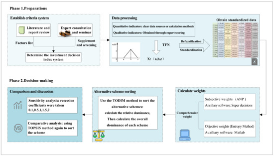 The investment decision framework is divided into two phases. Phase 1 is the preparation phase, including the establishment of the criteria system and data processing. Phase 2 is the decision-making phase, including the calculation of indicators weights, alternative scheme sorting and comparative discussion. Figure 4 depicts the decision-making framework for EPC-DPV projects constructed in this paper.