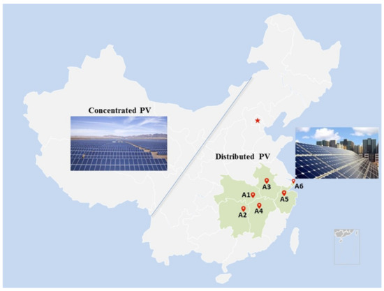 The six projects initially selected are located in the central and eastern provinces of China, as shown in Figure 6. A1 is located in Huangshi City, Hubei Province; A2 is located in Changsha City, Hunan Province; A3 is located in Hefei City, Anhui Province; A4 is located in Nanchang City, Jiangxi Province; A5 is located in Hangzhou City, Zhejiang Province; A6 is located in Shanghai. The installed capacity of the DPV power generation system is set to 1000 KW. The PV power generation system is installed on the roof of the industrial and commercial enterprise’s plant in the municipal district. The areas where these six projects are located are all suitable for the development of DPV power generation projects, with the conditions for DPV power generation to be consumed nearby, and the remaining amount of access to the grid.