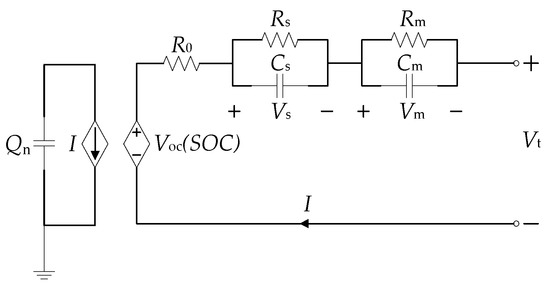 There have been many attempts to establish an appropriate battery model for simulating the external characteristics of a battery. The common categories are electrochemical models and equivalent circuit models (ECMs). Electrochemical models comprise a set of coupled partial differential equations which describe how the battery’s potential is produced and affected by electrochemical reactions inside the battery. It is quite accurate, but its calculation is also quite complex. In general, the electrochemical model is applied to design the battery body. The ECM constructed using basic circuit components such as resistors, capacitors, and voltage sources strikes a balance between complexity and accuracy. Meanwhile, the state–space equation is easy to derive, so that the ECM can be embedded into microprocessors and can output the results in real time. Based on existing research, the higher the RC order, the more accurate the ECM is and the more complex the calculation is. In this paper, the SRCECM is chosen, as shown in Figure 1.