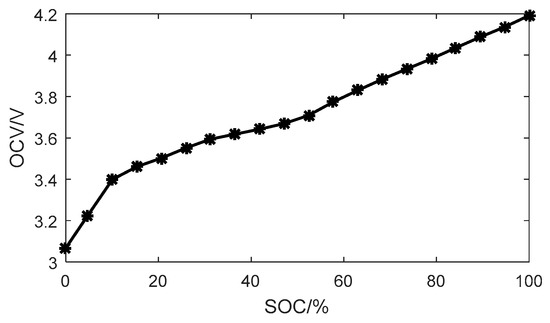 During a small range of the SOC indicated by the asterisks in Figure 2, the nonlinear relationship between the OCV and SOC can be considered linear [19]. Therefore, the OCV is expressed as a linear function of the SOC by using the piecewise linearization method:
