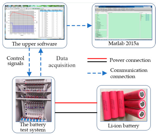 The experimental platform shown in Figure 3 was built to identify the model parameters and estimate the SOC. The Li-ion battery used in the experiment comprises a graphite cathode and a ternary composite anode of nickel, cobalt, and aluminum. It has a nominal capacity of 2.5 Ah and a nominal voltage of 3.6 V. The dimensions of the Li-ion battery are 18 mm diameter and 65 mm height. This kind of battery is commonly referred to as being of the “18650” format. The battery test system is used to charge or discharge the battery, which has a built-in current integrator that can be used to calculate the SOC reference. Its measurement ranges are 0~5 V and 0~5 A, and the measurement accuracy is ±5 mV/±5 mA. The upper software controls the charging or discharging mode and records the voltage and current data. The sampling interval was 10 s, and the experiment was carried out at room temperature.