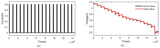 Model parameter identification is used to make the model output as close to the battery output as possible utilizing the input and output of the battery with the aid of some mathematical algorithms. Currently, the off-line identification method is more widely applied, since on-line identification is sensitive to the initial values of coefficients and has stability problems due to the cross interference between the model parameters and SOC [30]. A more robust off-line identification method is to fit rest periods of experimental data with exponential functions; therefore, based on the above principle, the pulse current discharge profile as an off-line approach was applied to identify the model parameters. As shown in Figure 4a, the pulse current profile consists of many sequences of discharge and rest. Initially, the battery was fully charged (SOC = 100%) and rested for one hour to return to the equilibrium state. Then, the battery was discharged by 0.5 A, corresponding to a 0.2 C discharge ratio for 15 min. After the discharge process, the battery was rested for 1 h to allow the terminal voltage to reach the OCV. Each pulse current discharged approximately 5% of the actual capacity of the battery, which is equivalent to about 5% of the SOC. The sequence of discharge and rest was iterated until the terminal voltage was less than the cut-off voltage of 2.5 V, meaning that the battery was fully discharged (SOC = 0%). The last discharge data was abandoned because of the lack of the last resting period data. It can be seen that there were 18 transient voltage responses generated to determine 18 groups of model parameters for 18 different SOCs. Incidentally, the nonlinear relationship between the OCV and the SOC was obtained, as shown in Figure 2. The specific parameter identification process is as follows.