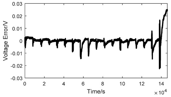 The identified model parameters for the different SOCs are listed in Table 1 with the curve fitting errors represented by root mean square errors (RMSE). The SRCECM has a very small deviation in the fitting profile. For the last rest sequence, the identified parameters cause the largest model error because the polarization effect of the battery is the most serious. The fitted voltage of the model is compared with the actual voltage in Figure 4b and Figure 6, showing the voltage error of the model. The voltage error is quite small in the range SOC [0.1 1]. The largest error also exists around the cut-off voltage region. The model RMSE is 0.0037. To test the model’s flexibility, another larger constant current (0.8 C) profile was applied to both the battery and the established model. The model voltage compared with the actual voltage of the battery is shown in Figure 7a, in which the model’s voltage error has similar characteristics as in Figure 4b. The voltage error is shown in Figure 7b. The discharge end area also has large modeling error while the other error is quite small. The model RMSE is 0.0156.