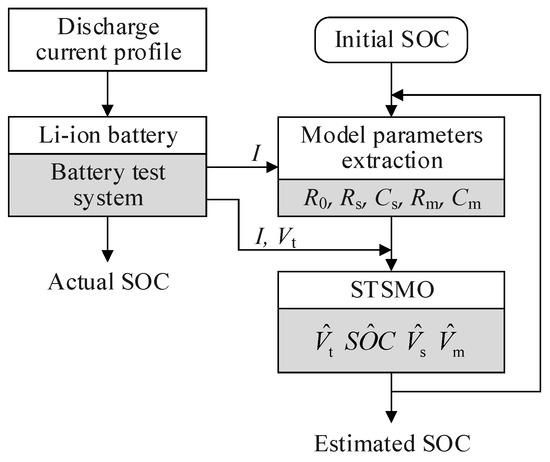 The configuration of the STSMO for the SOC estimation is illustrated in Figure 8. The upper software executes the discharge command and the Li-ion battery is discharged according to the established current mode. The actual current and voltage of the battery are sampled constantly every 10 s and fed into the model to obtain the model parameters. Then, the STSMO updates the SOC based on the observation error utilizing all the parameters and sampling data.