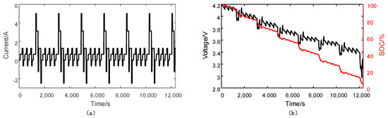 Dynamic stress test (DST) discharge profile: (a) the current; (b) the terminal voltage and the SOC.